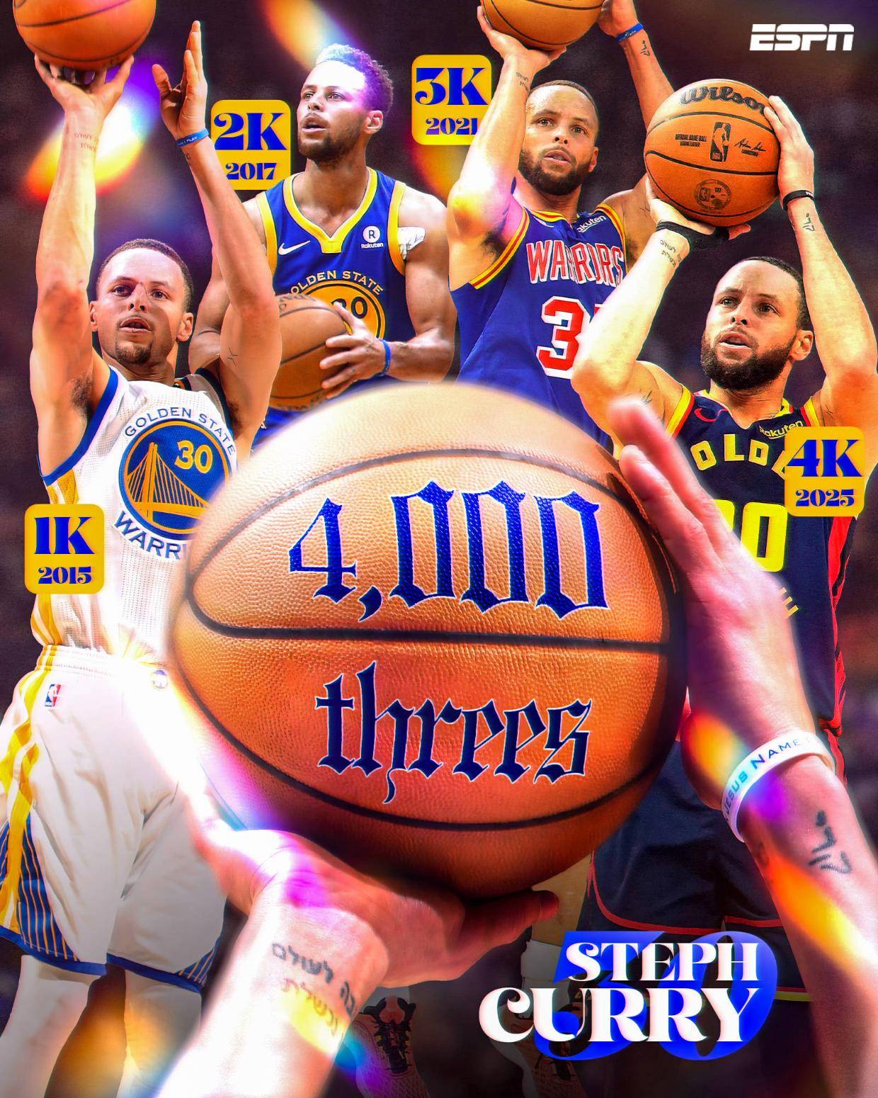 比赛第三节,库里命中了本场比赛个人第二记三分。凭借这颗三分,库里生涯三分总命中数正式突破4000大关!前无古人,后也很难有来者的一项伟大纪录。而且这个纪录仍然在延续!